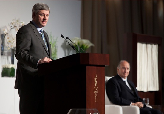 Prime Minister Stephen Harper giving his address at the opening of the Delegation of the Ismaili Imamat Building in Ottawa in the presence of His Highness the Aga Khan in 2008. Photo: The website of the Prime Minister of Canada.
