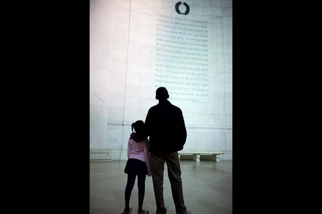 The President and his daughter Sasha read one of Thomas Jefferson’s speeches at the Jefferson Memorial one Sunday night in Washington, D.C. The entire family toured the Memorial and later the Washington Monument. (Official White House Photo by Pete Souza)