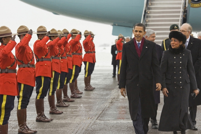 President Obama is welcomed to Canada by Governor General Michaelle Jean and a contingent of Royal Canadian Mounted Police. February 19, 2009. (Official White House Photo by Pete Souza)