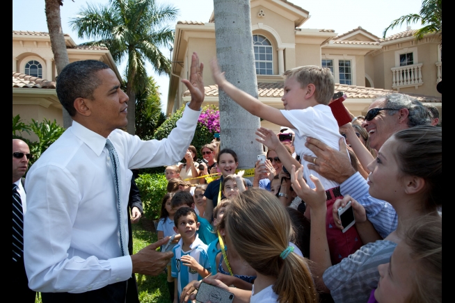 President Barack Obama high fives a young boy outside an event in Palm Beach Garden, Fla., April 10, 2012. (Official White House Photo by Pete Souza)