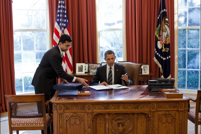 President Barack Obama prepares to sign legislation in the Oval Office, Jan. 3, 2012. Staff Secretary Rajesh De is pictured at left. (Official White House Photo by Pete Souza)