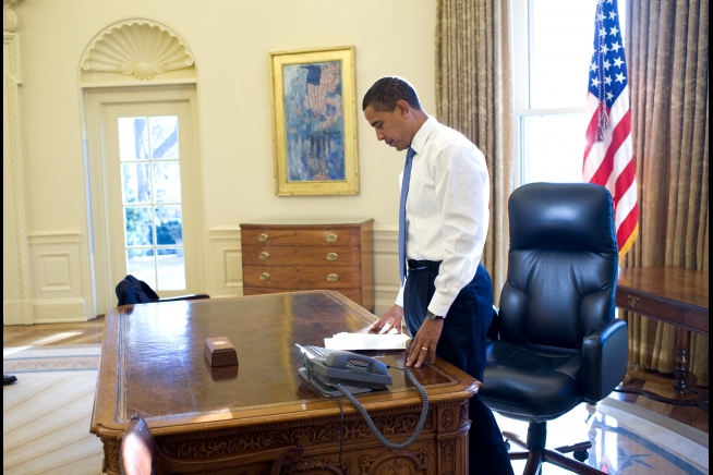 Jan. 21, 2009 “This was his first morning in the Oval Office as President of the United States. He was reading some briefing material before a meeting.”