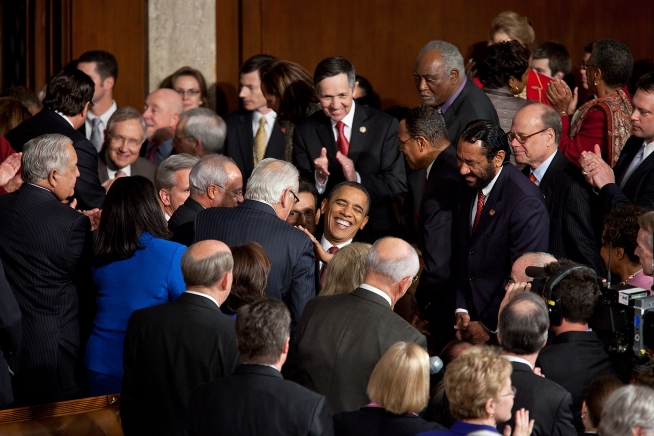 President Barack Obama greets Members of Congress as he arrives in the House Chamber at the U.S. Capitol in Washington, D.C., to deliver the State of the Union address, Jan. 24, 2012. (Official White House Photo by Chuck Kennedy)