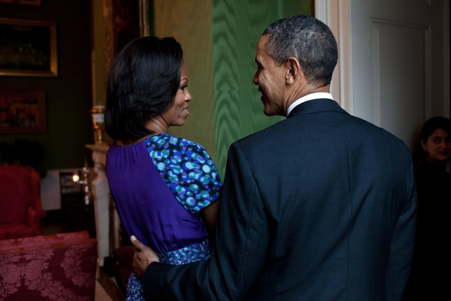 President Barack Obama and First Lady Michelle Obama talk in the Green Room of the White House before hosting a Smithsonian Museum of African American History reception in the East Room, Feb. 22, 2012. (Official White House Photo by Pete Souza)