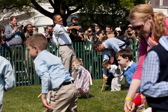 President Barack Obama reacts as children push eggs across the South Lawn during the 2012 White House Easter Egg Roll, April 9, 2012. (Official White House Photo by Pete Souza)