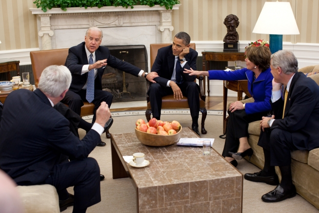Nov. 1, 2011 “Usually the best moments at meetings are before and after the participants actually sit down. In this case, though, there was an interesting juxtaposition of gestures as the President and Vice President met with the House Democratic Leadership in the Oval Office.” (Official White House Photo by Pete Souza)