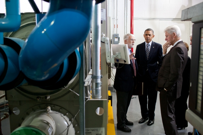President Barack Obama and former President Bill Clinton listen as Gary Le Francois, Senior Vice President and Director of Engineering, leads them on a tour of the Transwestern Building in Washington, D.C., Dec. 2, 2011. The 240,000 square foot office building is undergoing renovations to the façade and internal systems that are expected to raise their ENERGY STAR rating to 95 (out of 100). (Official White House Photo by Pete Souza)