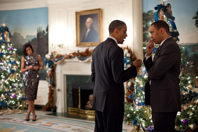 Dec. 15, 2011 “Interrupting a Christmas Holiday photo line, the President confers with Rob Nabors, Assistant to the President for Legislative Affairs, about the latest developments in the payroll tax cut extension as the First Lady waits in the background.” (Official White House Photo by Pete Souza)
