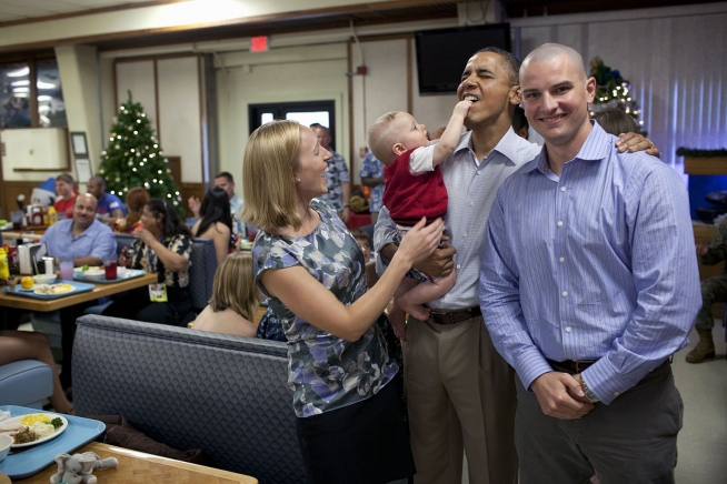 Eight-month-old Cooper Wagner grabs President Barack Obama’s face while taking a picture with his parents, Captain Greg Wagner and Meredith Wagner, at Marine Corps Base Hawaii in Kaneohe Bay, Hawaii, Sunday, Dec. 25, 2011. The President and First Lady Michelle Obama visited with members of the military and their families during Christmas dinner at Anderson Hall. (Official White House Photo by Pete Souza)