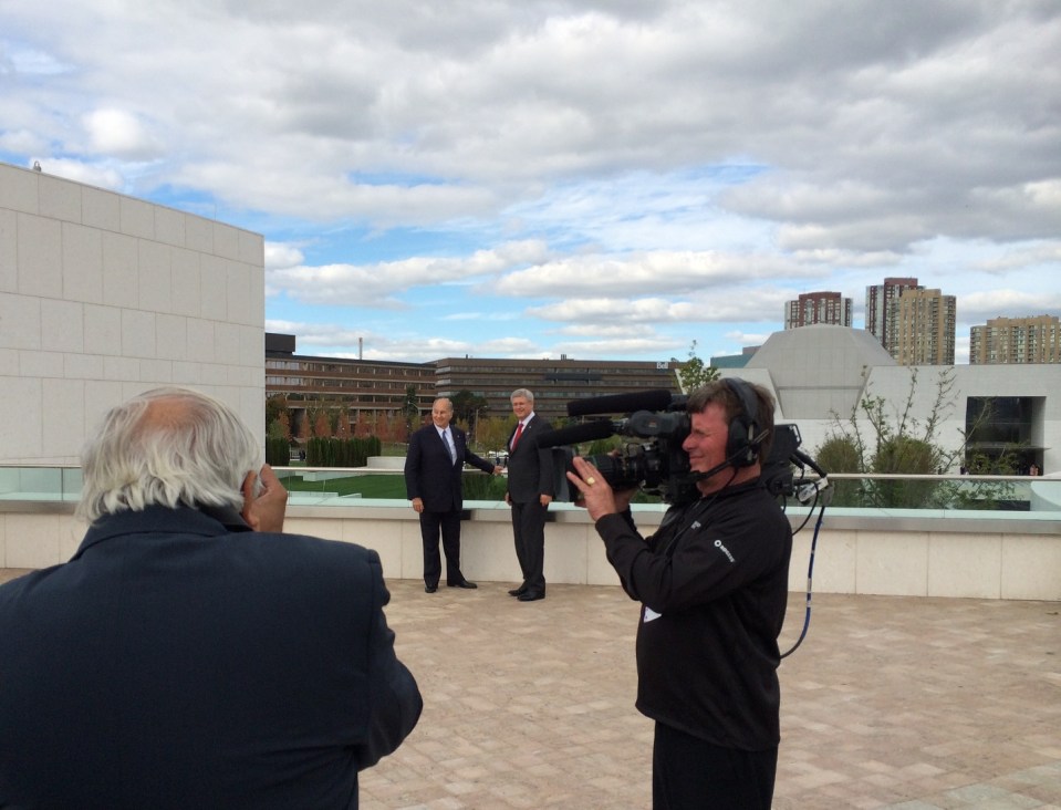 With the Aga Khan Museum in the background, Prime Minister Stephen Harper and  the museum’s builder, His Highness the Aga Khan, get attention from the media during a photo opportunity which took place on the terraces of the Ismaili Centre shortly after it was officially opened. The Prime Minister and His Highness then walked to the Aga Khan Museum, passing the Park along the way. Photo: Malik Merchant/Simerg. Copyright.