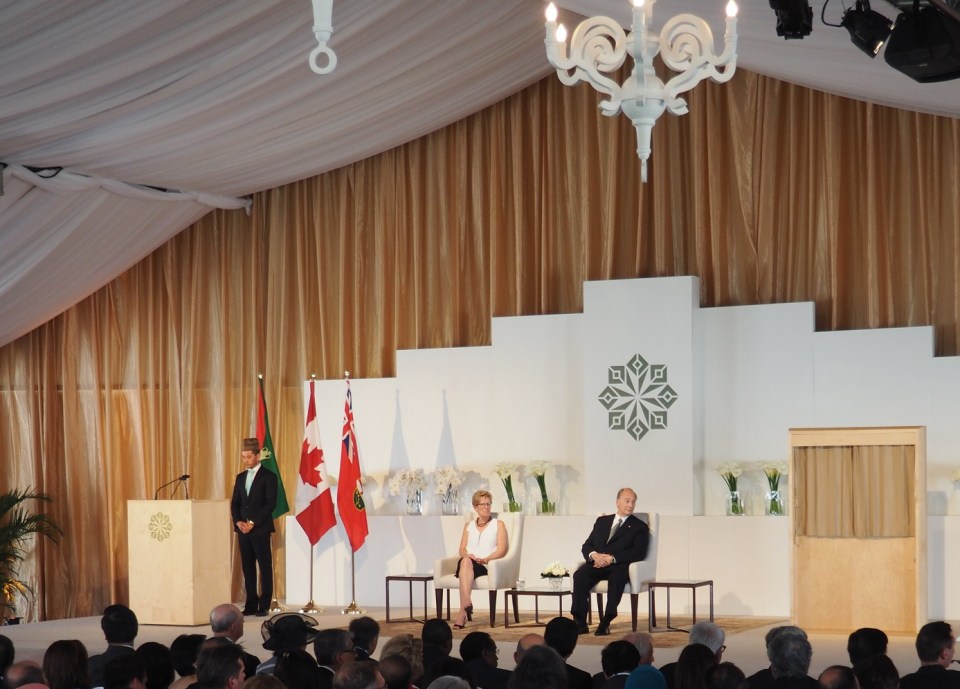 Mawlana Hazar Imam, Premier Kathleen Wynne and the reciter of the Holy Qur’an, Ahsan Afzally, look on as a translation of the Qur’anic verses in English and French is underway during the opening ceremony of the Aga Khan Park on May 25, 2015. Photo: Simerg/Malik Merchant. Copyright.
