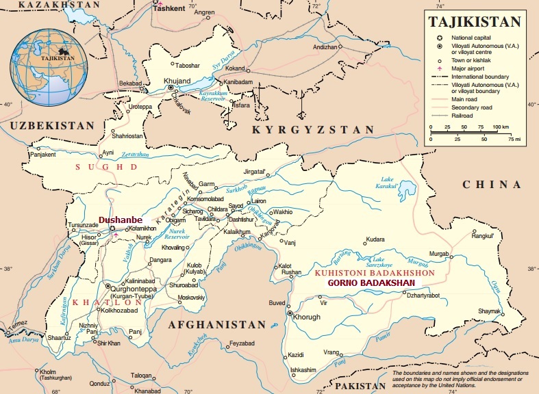 A map of Tajikistan with surrounding countries. Among the places Muslim and Nevin Harji visited during their adventurous and heart warming trip to Tajikistan were Dushanbe, Tajikistan’s capital, and the autonomous region of Gorno-Badakhshan which is inhabited by Ismailis in very large numbers. Image: United Nations, with Dushanbe and Badakhshan highlighted by Simergphotos.