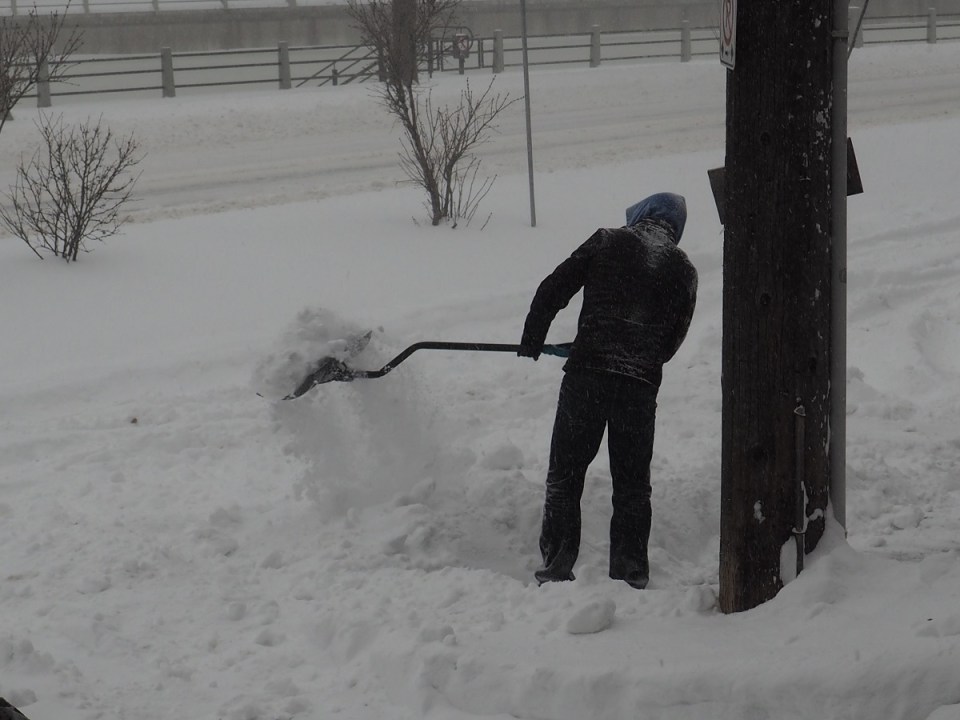 My neighbour uses a shovel to clear his driveway after a heavy overnight snow fall; the water in the canal, between the iron fences, finally gives in to snow. Photo: Malik Merchant/Simerg.