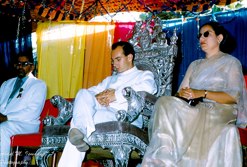 14. Incomplete caption (location/names of married couple with His Highness). Mawlana Hazar Imam, His Highness the Aga Khan, blesses a newly wed couple during his visit to Karachi, Pakistan in 1961. Photo: Abdul M. Ismaily. Copyright.