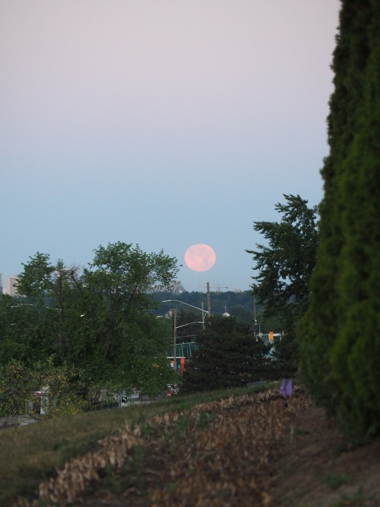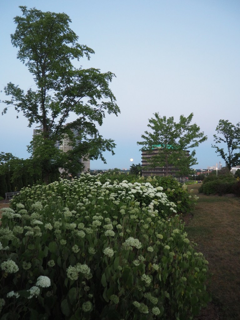 The sky in Toronto on July 4 at 9 P.M. was still bright. I was at the Aga Khan Park (2015) which separates two majestic buildings — the Aga Khan Museum and the Ismaili Centre (both 2014) — built by His Highness the Aga Khan, the 49th Imam of the Ismailis and the direct descendant of the Prophet Muhammad. The Don Valley Parkway and neighbourhood street and residential lights were coming on, and looked brighter with each passing minute. By 10 P.M. the brightness of the artificial lights completely shrouded my view of the moon that had risen a few minutes earlier. I asked a passer by if she had seen the full moon; she asked me to turn around, and there it was.