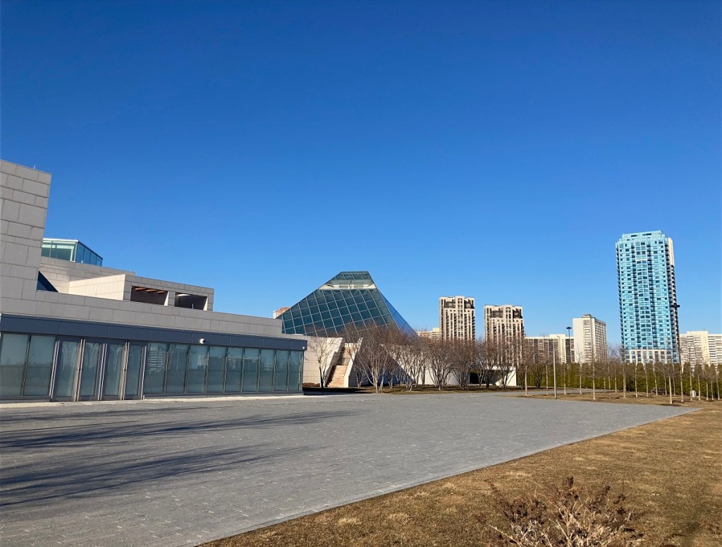 Looking diagonally across the Aga Khan Park from a parking area at the Ismaili Centre (address 49 Wynford Drive), a view of the Aga Khan Museum (address 77 Wynford Drive) with flags of the Ismaili Imamat, the city of Toronto, the province of Ontario and Canada at left, where they meet Wynford Drive (not showing). The surrounding highrises are condominium or apartment buildings located on Wynford Drive or streets adjacent to it including Concorde Place. Photo: Malik Merchant/Simerg.