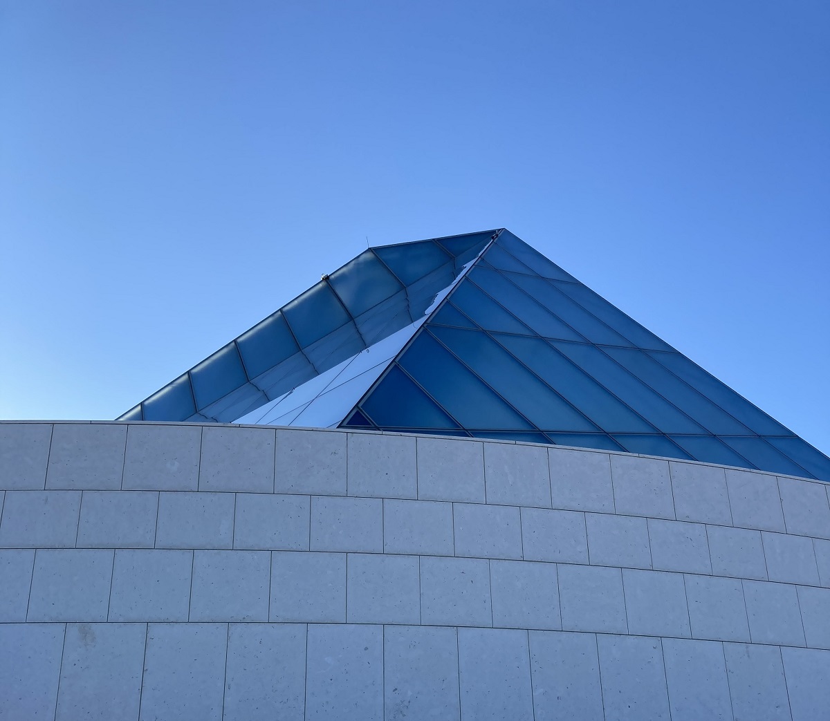 The sun setting in the west casts a shadow of the Big Heech sculpture on the front wall of the Aga Khan Museum on March 13, 2021. Photo: Malik Merchant/Simerg.