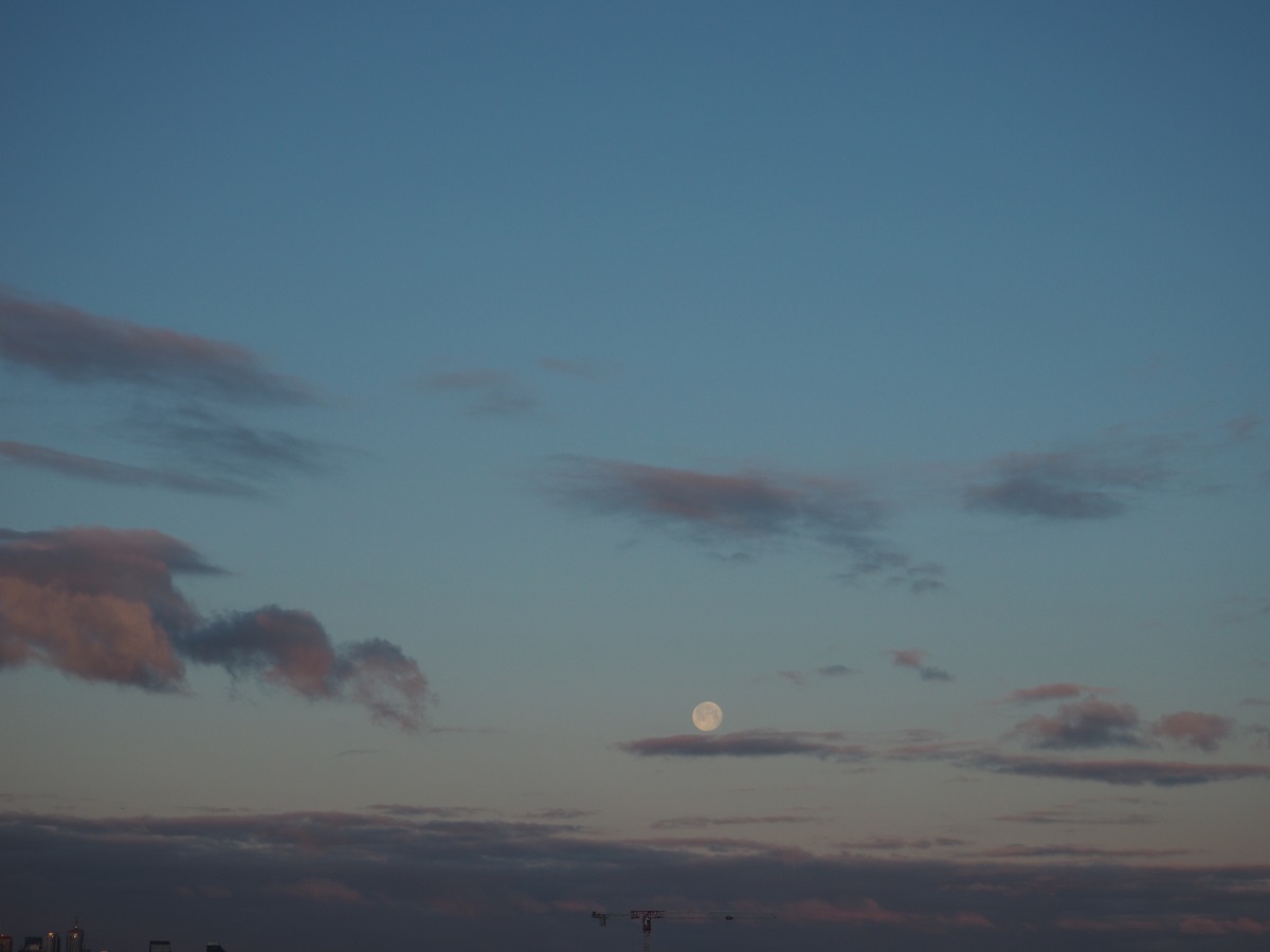 Moon illuminated at 99.3% is pictured at 7:16 AM on the morning of March 29, 2021, shortly after sunrise at the opposite end. Photo: © Malik Merchant/Simergphotos.