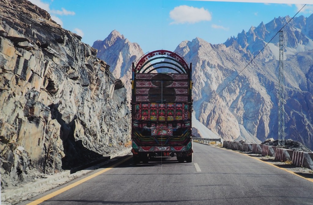 An uninterrupted close-up view from the previous image of a decorated truck lumbering through Khunjerab Pass near the Pakistan-China border carrying goods for sale. Christopher Wilton-Steer tells the story of his 40,000 kilometre journey from Venice to Beijing through several panels that are displayed at Aga Khan Park. October 22, 2021. Panel photo: Malik Merchant/Simergphotos.