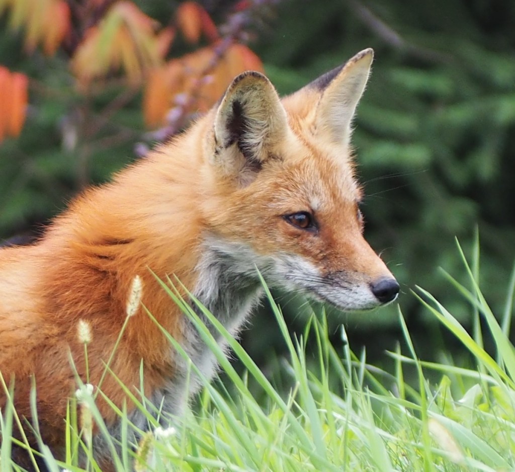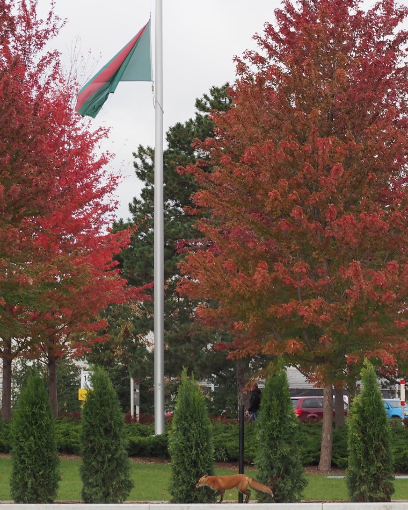The primary place, at the moment, to see spectacular fall colours at Aga Khan Park is by Wynford Drive, where the Ismaili flag and flags of Toronto, Ontario and Canada are located. I wasn’t thinking about the fox. I then went to the section of the park behind the Ismaili Centre, where Amur maple trees have yet to show their best autumn colours. Only a few of the many Amur trees are showing true fall colours. I was quite occupied with my camera when I heard my name being called out from 50 metres away. It was the park’s security guard, the same gracious and kind gentleman who during spring had led me to the site where 6 goslings were born — a post in this blog that was read by thousands around the world. He showed me the fox, and wow, what a beautiful animal it is.