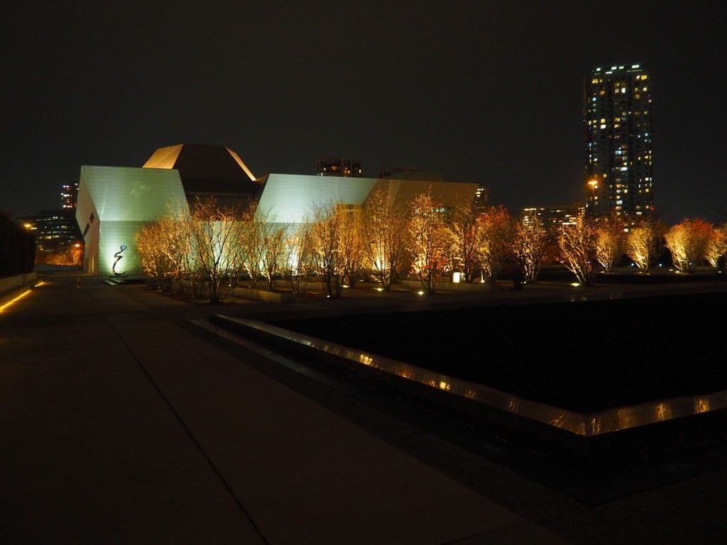 The camera in my car summoned me to take pictures without delay. I was able to take just 3 photos before the Jamatkhana lights went out at around 8:30 PM — the trees however remained lit. I then walked to the Aga Khan Museum. The building as well as the Aga Khan Park grounds in front of the main entrance looked stunning with lit-up trees, and the fading autumn leaves added glory to the scene. Please enjoy these photos from a very brief session of picture taking at my favourite spot in Toronto.