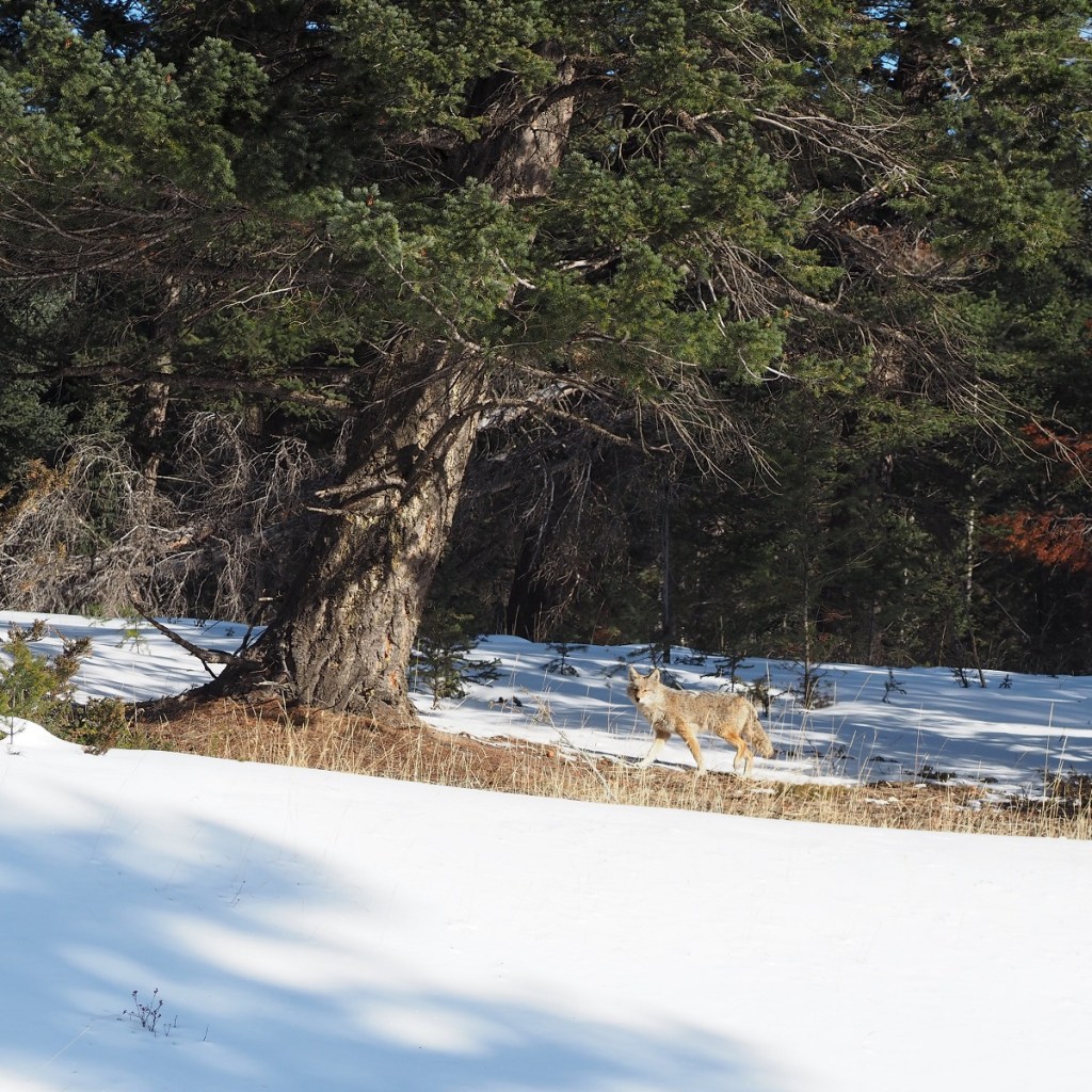 A beautiful coyote walks towards a tree by Tunnel Mountain Road, Banff, March 2023. Photograph: Malik Merchant/Simerg Photos.