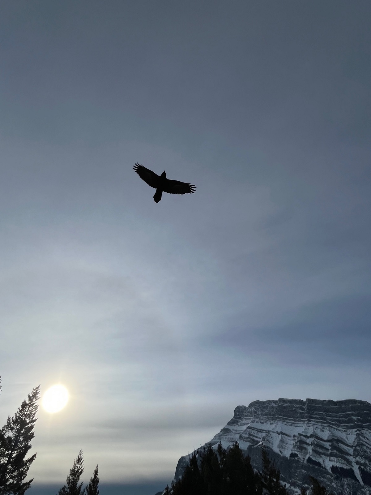 A raven flies over the lookout point where photographs of the elks shown in this post were taken, March 2023. Photograph: Becky O’Donnel owner of A Banff Boutique Inn. Becky provided excellent insights into the area and the Banff National Park in general.