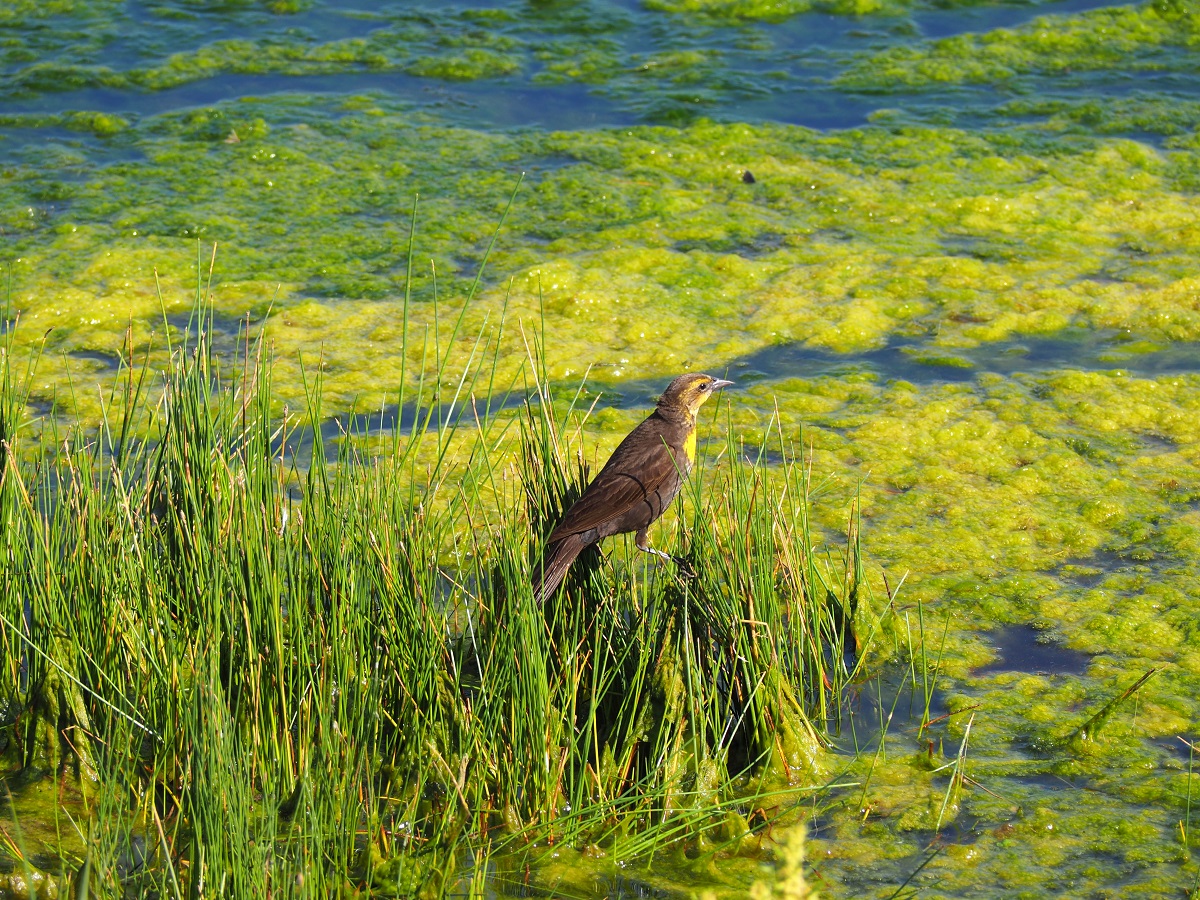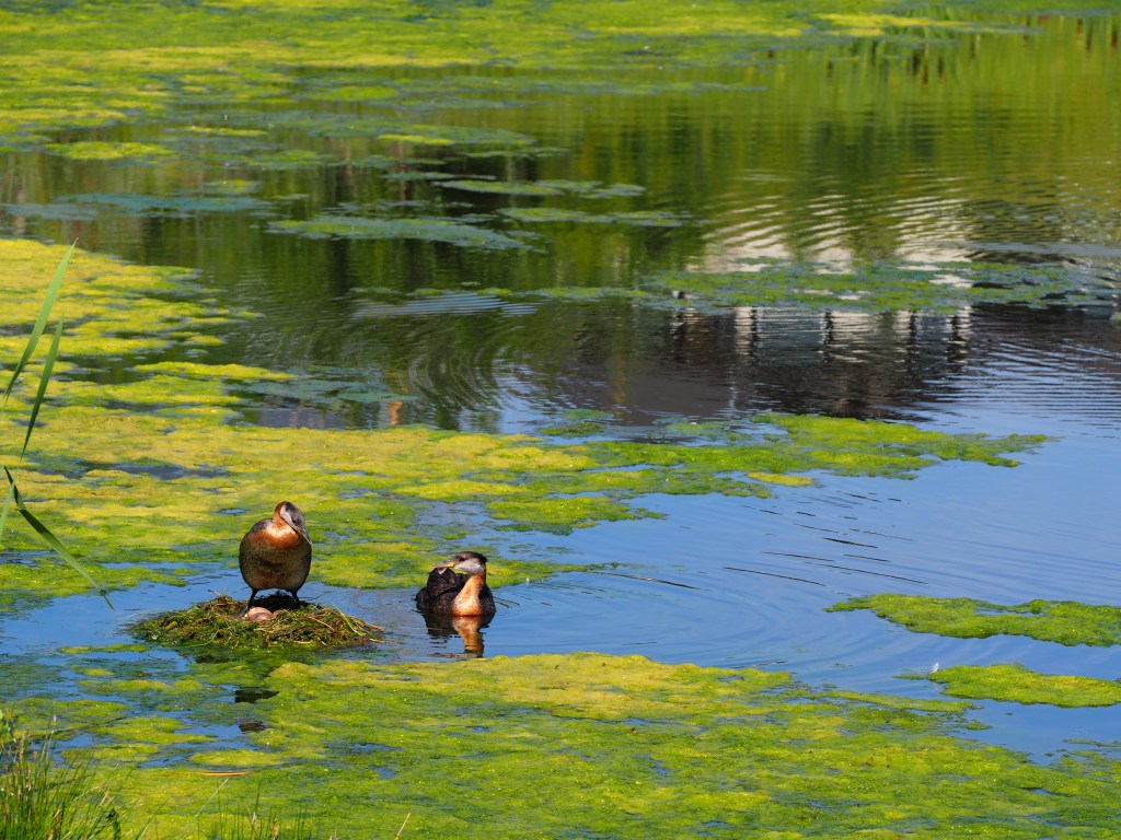 A breakfast at 8:30 AM at the McDonald’s close to the location of the pond set the stage for me for the next 5 hours. When I arrived at the pond’s north side, I pulled out my binoculars and sighted the Grebe and its mate diagnolly across from me. As I learned, both the male and female incubate. I hurried, bypassing all the bird chirping and animals I saw along the path. When I reached the Grebes’ nesting area, I positioned myself about 25 metres from the nest.