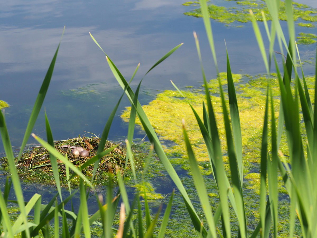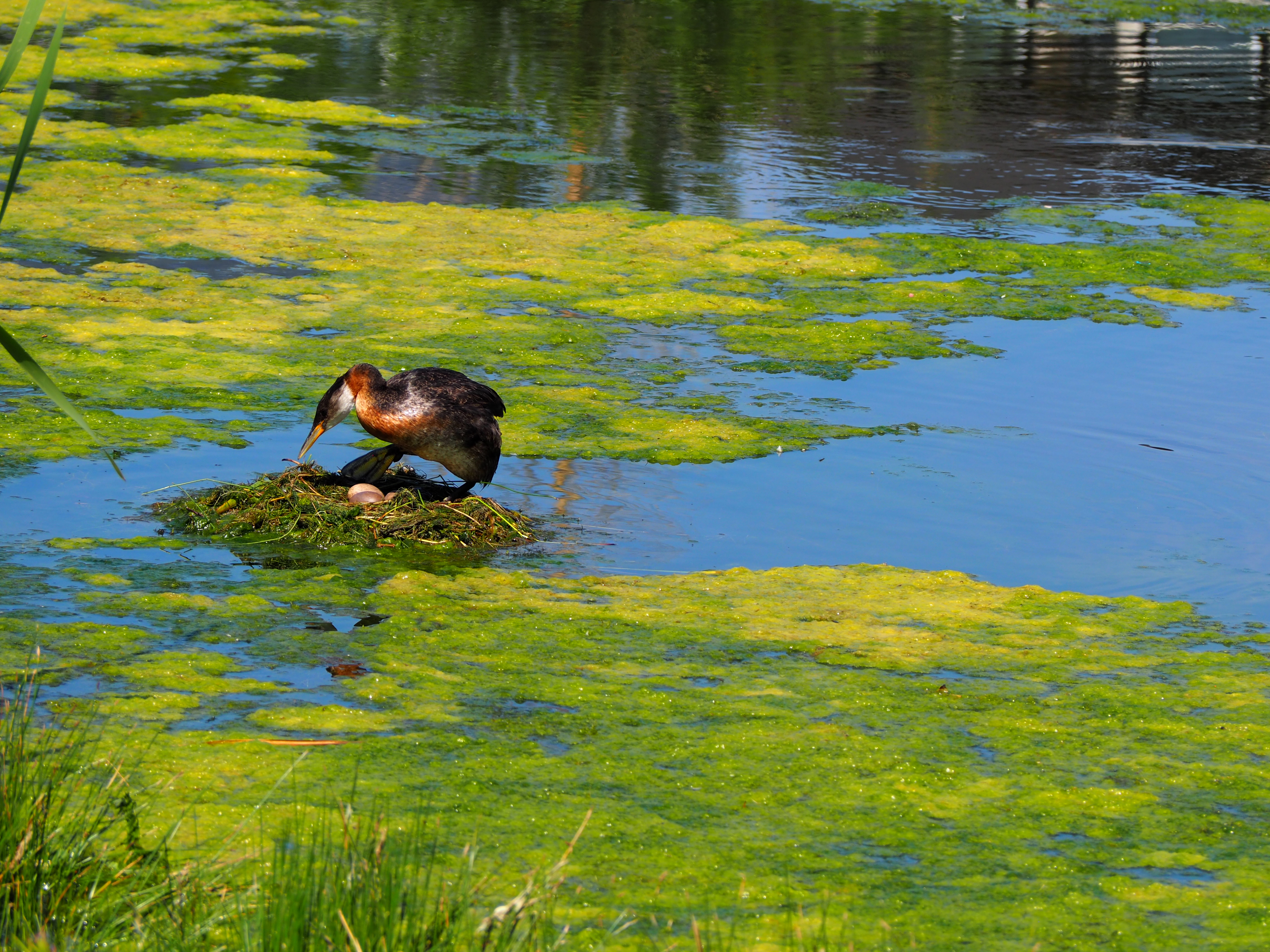 However, I was drawn to stay in Calgary because a few days earlier, while on my first photographic walk in a Stormwater Wet Pond on Calgary’s Country Hills Blvd, I had spotted a Red-necked Grebe incubating her eggs in a nest that was floating in the pond’s marshy water. I said that I would not miss the hatching show and decided to stay back, just in case luck was on my side. Of course, there were no guarantees that the eggs would hatch as the incubation period for the Red-necked Grebe can be between 20-23 days. The grizzlies, bighorn sheep, moose and elks as well as the beautiful trails in the Kananaskis Country would always be there but the hatching is an annual occurence.