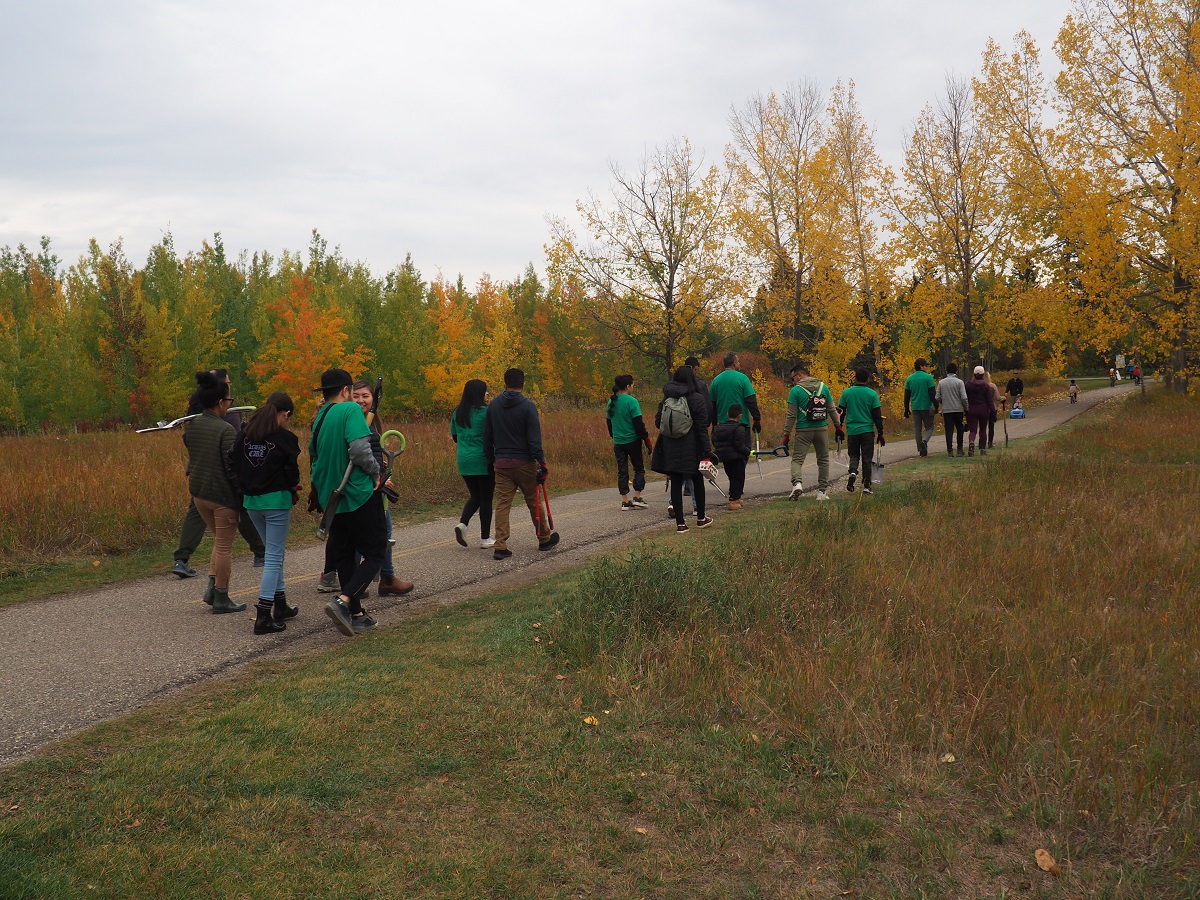Ismaili Civic Day volunteers walk through a section of Weaselhead Park rich in fall colours; Calgary, September 24, 2023. Photograph: Malik Merchant/Simerg Photos.