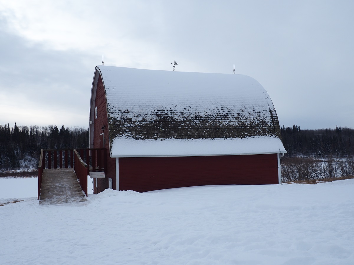 This barn at Métis Crossing is dedicated to the people of Alberta to commemorate the 100th anniversary as a proud member of the Canadian Confederation. It contains informative Métis cultural and historical displays, February 11, 2024. Photograph: Malik Merchant/Simerg Photos.
