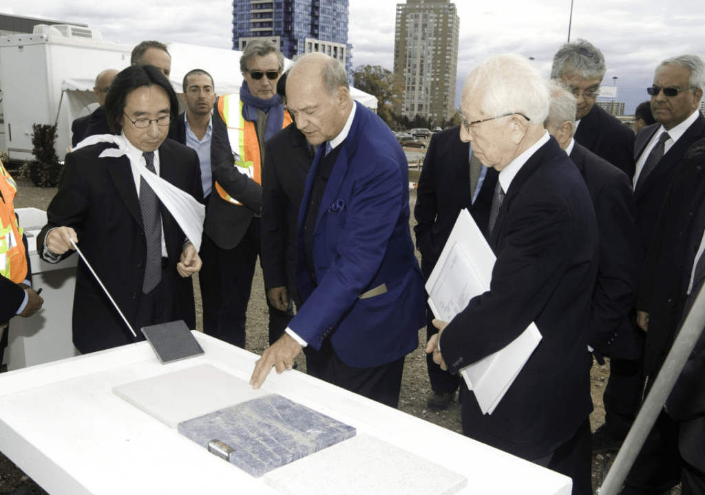 Fumihiko Maki, architect of the Aga Khan Museum, and Gary Kamemoto of Maki & Associates review cladding stone for the Aga Khan Museum with His Highness the Aga Khan; October 2010. Photograph: The Ismaili.