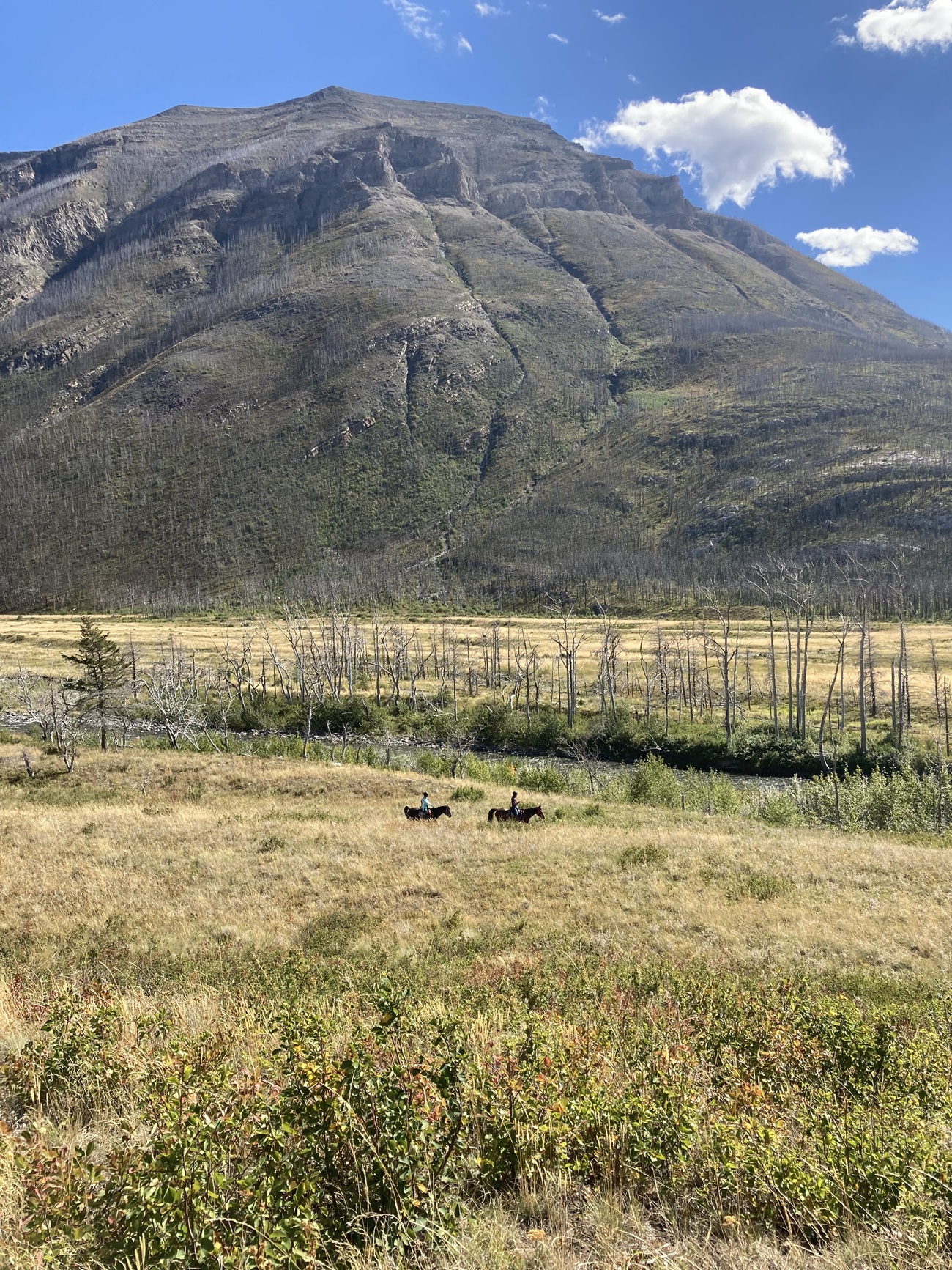 A beautiful view of horseback riders on a trail by the Red Rock Canyon Parkway, Waterton Lakes National Park, Alberta, Canada; September 3-6, 2024. Photograph: Malik Merchant/Simerg Photos.