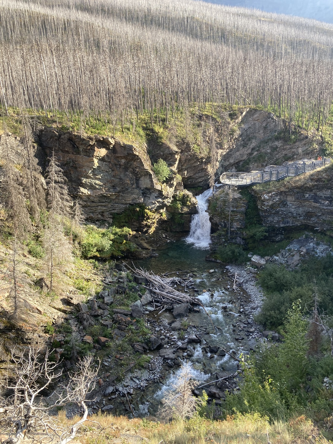 Blakiston Falls is an an easy 1-kilometre walk from the Red Rock Canyon, and has fantastic lookout points. Note the burnt-out trees from the Kenow wildfire in 2017, Waterton Lakes National Park, Alberta, Canada; September 3-6, 2024. Photograph: Malik Merchant/Simerg Photos.