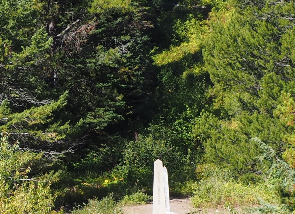 Cruise boat on Upper Waterton Lake passes white posts marking the border separation between Waterton Lakes National Park in Alberta, Canada, and Glacier National Park in Montana, USA; September 3-6, 2024. Photograph: Malik Merchant/Simerg Photos.